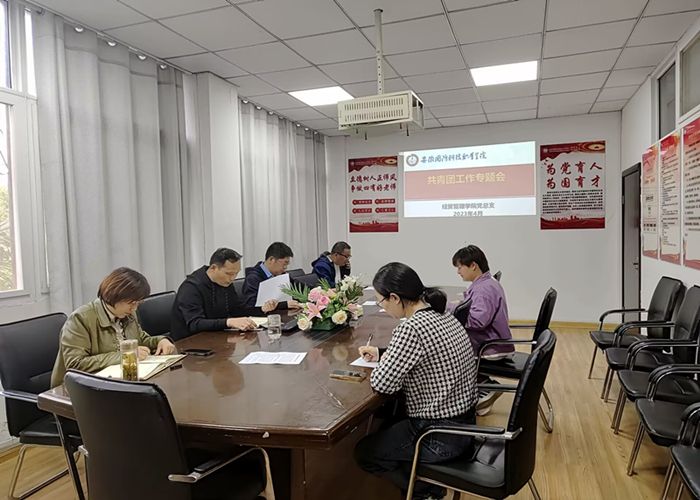 本网讯(经贸管理学院 丁丁)4月28日上午,经贸管理学院党总支召开专题会议,研究学院共青团、学生会等工作,院党总支成员杨力、杨学分、张圣霞参加了会议,会议由党总支书记刘峰主持。