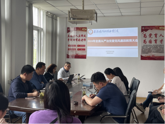 4月24日下午,经贸管理学院召开2024年度全面从严治党暨党风廉政建设教育会,学院全体党员参会,会议由学院党总支书记刘峰主持。