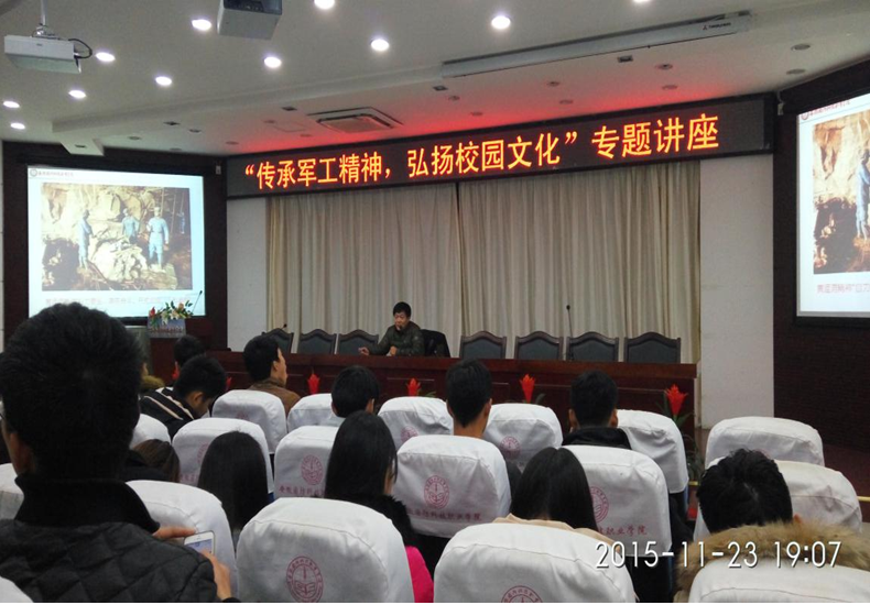 在“军工魂——学院文化传统教育”专题中,就业办副主任、军事理论课教师韩继平分别从“军工”、“红色”、“校园”、“文化”四个方面与大家探讨学院与军工的渊源,如何用军工精神营造良好的校园文化。