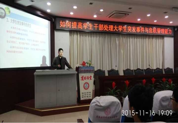 在“学生干部处理大学生突发事件与危机管理”专题中,管理(建筑)工程系党总支副书记杨力列举大量事实案例从多个角度对学生发生突发事件发生的原因进行详尽分析,并向大家介绍当学生干部遇到突发事件时处理的方法和策略。