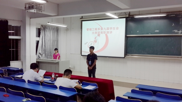 会上,参加竞选系学生会的2012级同学依次上台演讲,此次演讲分为自我我介绍、自我优劣势分析、工作计划三个环节。竞职中,大家满怀激情、感情充沛,规划了竞职岗位的工作设想,充分地展现了管理工程系学生干部良好的精神面貌和。
