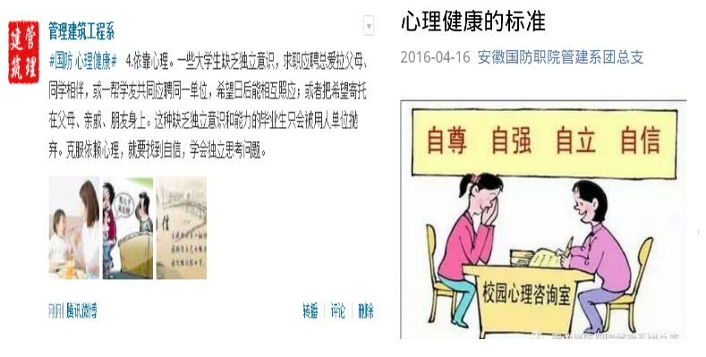 及时更新系团总支学生会微信微博。通过网络阵地积极宣传大学生心理健康节活动,在全体学生当中营造积极的氛围。