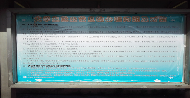 及时更新宣传橱窗。为培养大学学生良好的就业心理素质,帮助大学生树立正确的就业择业观念,我系对1号教学楼楼前的宣传橱窗进行了更新,紧紧围绕学校2016年心理健康教育节进行内容的设计与编排,介绍了大学生就业常见的心理困惑。整个橱窗内容设计清新简洁,对于帮助我院同学实现快乐就业、健康成长有着积极的作用。