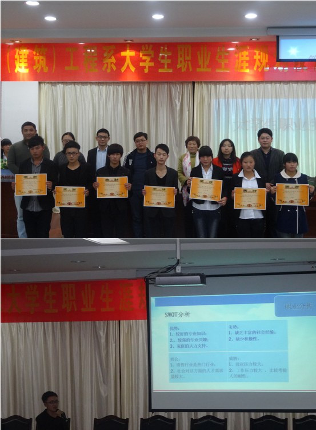 为强化大学生的职业生涯规划意识,培养大学生的就业创业能力,促进大学生的全面发展,1117下午,管理(建筑)工程系职业生涯规划大赛决赛在图书馆报告厅隆重举行。管理(建筑)工程系党总支副书记杨力、办公室主任张圣霞、团总支书记李文君、市场营销专业教师杨学分、11级辅导员付玉梅、12级辅导员雷雨及安徽墙煌彩铝销售公司副总经理何猛担任嘉宾。