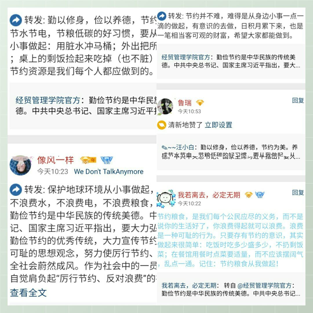 为深入学习贯彻党的十九大精神,围绕“立德树人,文明修身”这一活动主题,以“节电、节水、节粮”为重点,加强同学们的节约意识,同时也为建设节约型校园贡献出一份力量。经贸管理学院团总支学生会生活部于2017年12月24日中午在食堂门口举办“三节”活动。