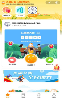 本次活动近1500人参加,活动方式采取在线上用微信小程序拍照打卡进行记录,要求打卡至少满21次。活动期间,我们在食堂门口摆放关于光盘行动的海报,并向同学们普及宣传光盘行动的相关知识,让同学们了解光盘行动的必要性。各部门协助人员在各自的任务岗位上认真的完成着自己的任务,宣传光盘行动的意义和利处。同学积极地参与其中,把“光盘行动”落实到日常生活的每一餐,就餐时尽量吃完盘中的食物,杜绝浪费,就餐后也会将餐具收拾好再有序地放到餐具回收区,同学们自觉的行动,不仅增强了自身的节约意识,也对周边的同学们起到了带动作用,推动了勤俭节约良好风气的形成。