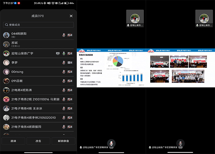 本次活动邀请安徽迎驾山泉股份有限公司六安大区经理陈广宇、安徽邻几便利店有限公司六安大区经理李亮做“就业创业”指导讲座。讲座主要面向经贸管理学院学生,采取线上+线下的形式。22级学生代表在实训楼502教室集中收看了本次讲座。讲座中,陈广宇经理,李亮经理,分别就各自的亲身经历,向同学们分享了他们创业就业的体会与心得,并一一回答了同学们感兴趣的“大学生该如何创业”、“大学生在创业就业的过程中应注意哪些”等问题,为同学们的职业规划进行了指导。同时他们也鼓励大家在校期间,要努力学习专业知识,树立正确的择业观念,要树立“勤奋斗,勇挑战”的创新精神,不断提高自身的综合能力。