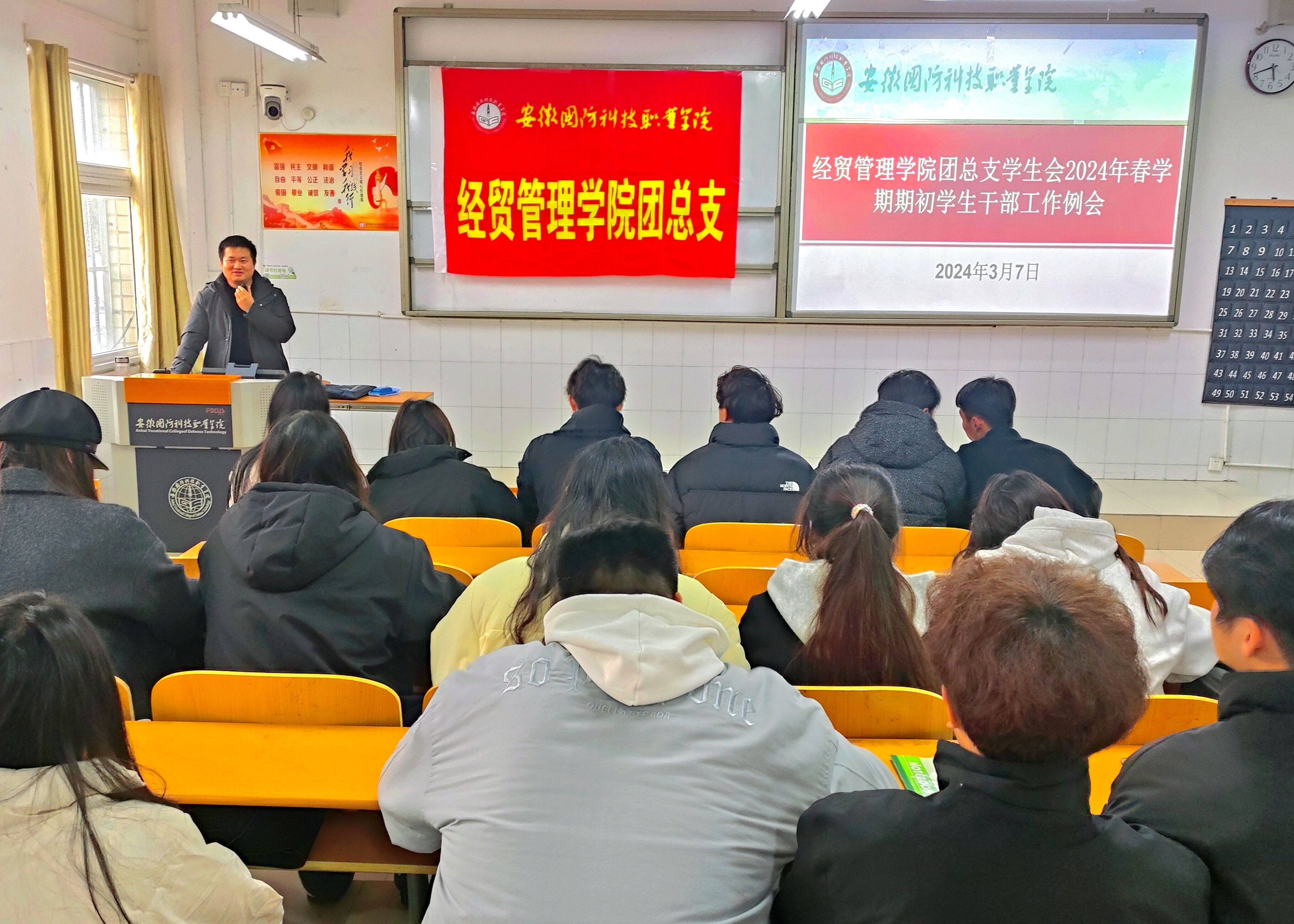 本网讯 为有力保障2024年春学期期初团总支学生会各项工作的有序开展,对新学期团学工作提出新要求、做出新规划,3月7日下午,经贸管理学院团总支学生会在2教105教室组织召开了2024年春学期期初全体学生干部工作例会,会议由团总支书记陈玮主持,院团总支学生会全体学生干部参加了会议。