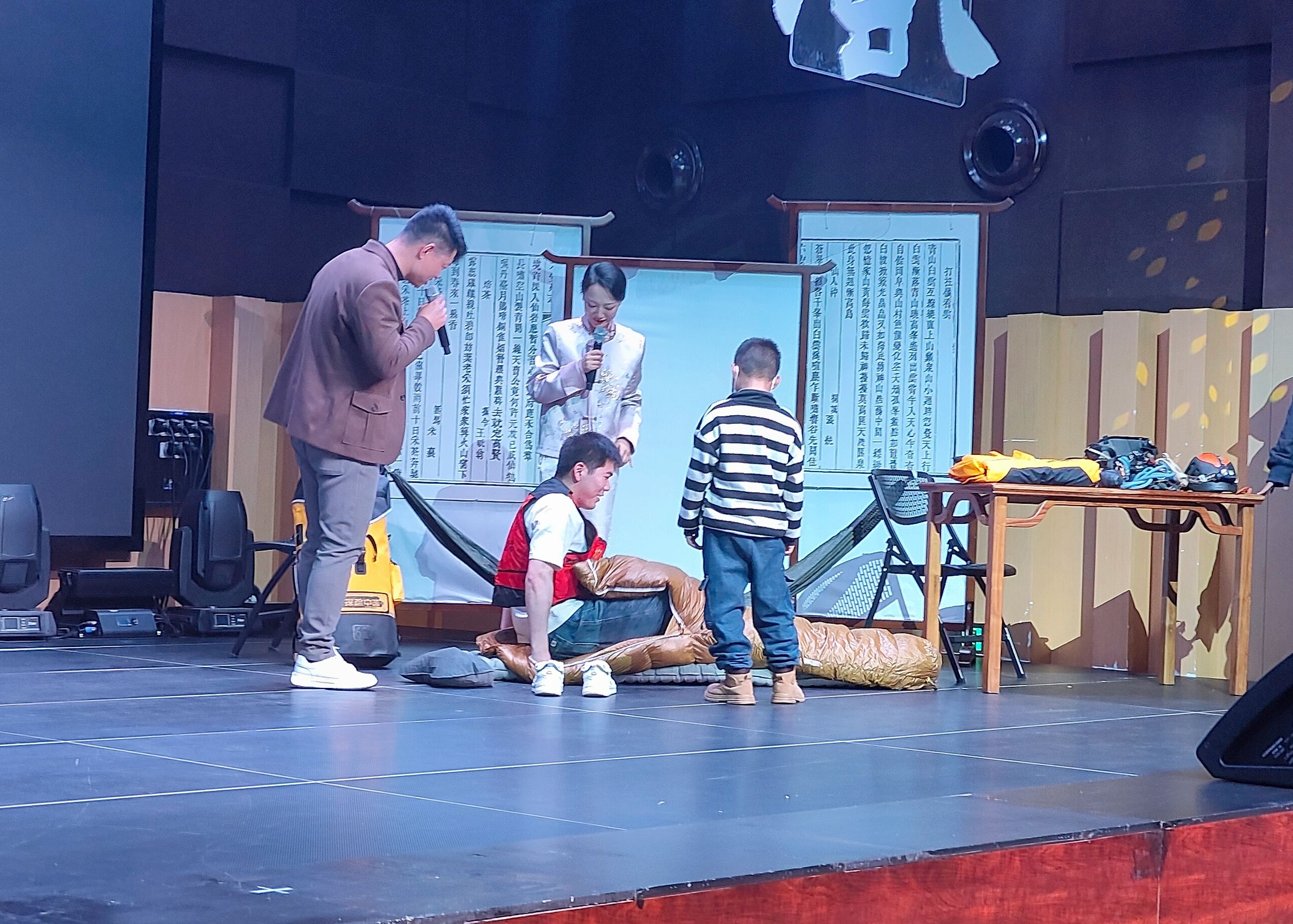 在活动现场,地心探险员王林老师绘声绘色地分享了其团队惊心动魄的探险经历。同学们在倾听的过程中,如身临其境,仿佛置身于怪石嶙峋的洞穴之中,感受到了那神秘莫测的地下世界,激发了同学们对地心探险科学活动的强烈兴趣。活动中,学生志愿者上台体验了王林老师探险时使用的睡袋,深刻感受到探险活动的艰辛不易,需要长久的坚持和毅力。学生志愿者们还与现场嘉宾进行了积极的互动问答,深入了解了六安的文旅产业发展情况。