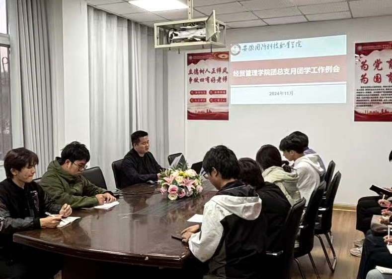 本网讯(学生通讯员 徐以勒)11月7日上午,经贸管理学院团总支在学院会议室顺利召开11月团学工作例会。本次会议由院团总支书记陈玮主持,团总支学生会主要学生干部及各部门负责人参加会议。