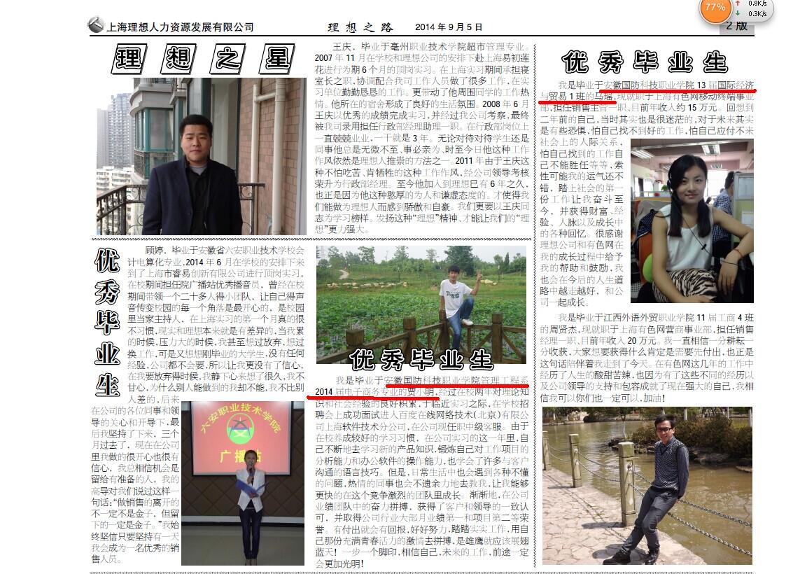 多年来,学院为深化校企合作模式,提高人才培养质量,实现校企合作共赢的目标,坚持内涵发展道路,以育人为根本,以就业为导向,以服务地方经济为宗旨,加强对学生技能和职业素养的培养,千方百计促进学生成人成才,培养了大批适应地方经济和社会发展需求的技术型、应用型高技能人才,深受企业认可和信任,并得到重用。近日,上海理想人力资源发展有限公司刊物《理想之路》就重点报道我院国际经济与贸易101班马瑶、电子商务111班贾小明、电子商务102班张玉、物流管理122班邱月等优秀毕业生和顶岗实习生。