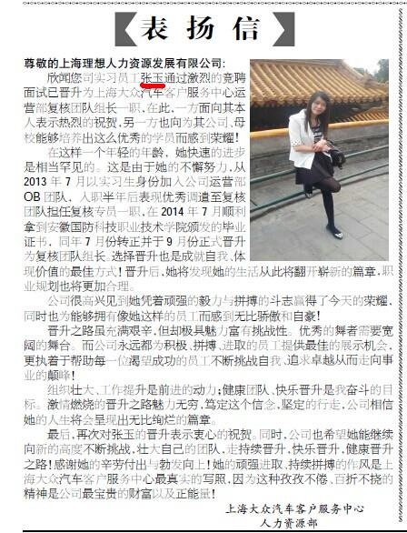《理想之路》还全文刊登了上海大众汽车客户服务中心人力资源部发给公司的表扬信,对电子商务102班张玉通过激烈的竞聘面试晋升为上海大众汽车客户服务中心运营部复核团队组长一职表示祝贺,也对我院能够培养出这么优秀的学生表示感谢。刊物还刊登了物流122班邱月的文章《国华伴我成长,我随国华同行》,分享了她在国华人寿保险股份有限公司顶岗实习的点点滴滴。