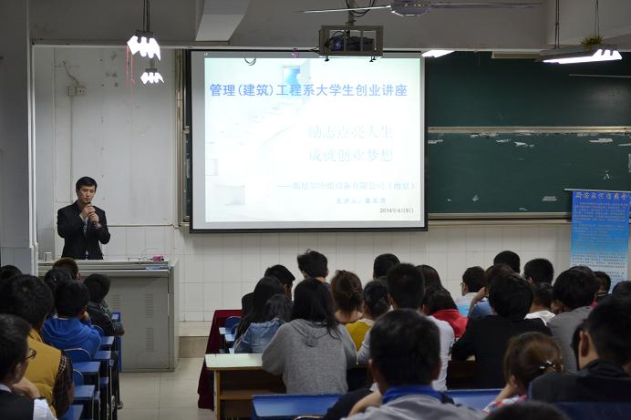 在管理(建筑)工程系体育文化节第九届“班级杯”篮球赛期间,2014年4月9日晚,章发贵经理携其团队举行了一场创业报告会。