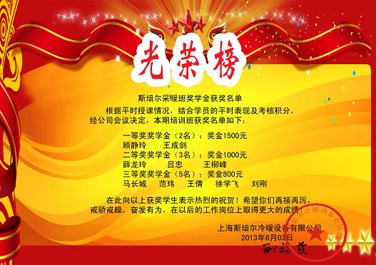 2013年5月,斯培尔公司为冠名班设立的一万元的奖学金奖励学习培训成绩优异的毕业生。工程造价班王成剑等10位同学获得奖学金。