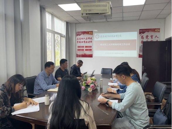 4月10日,经贸管理学院在学院会议室召开新进教师试用期满考核会,学院班子成员、新进教师李亚男、夏业领、孙健、张洋洋、刘星怡参会,会议由院长杨力主持。