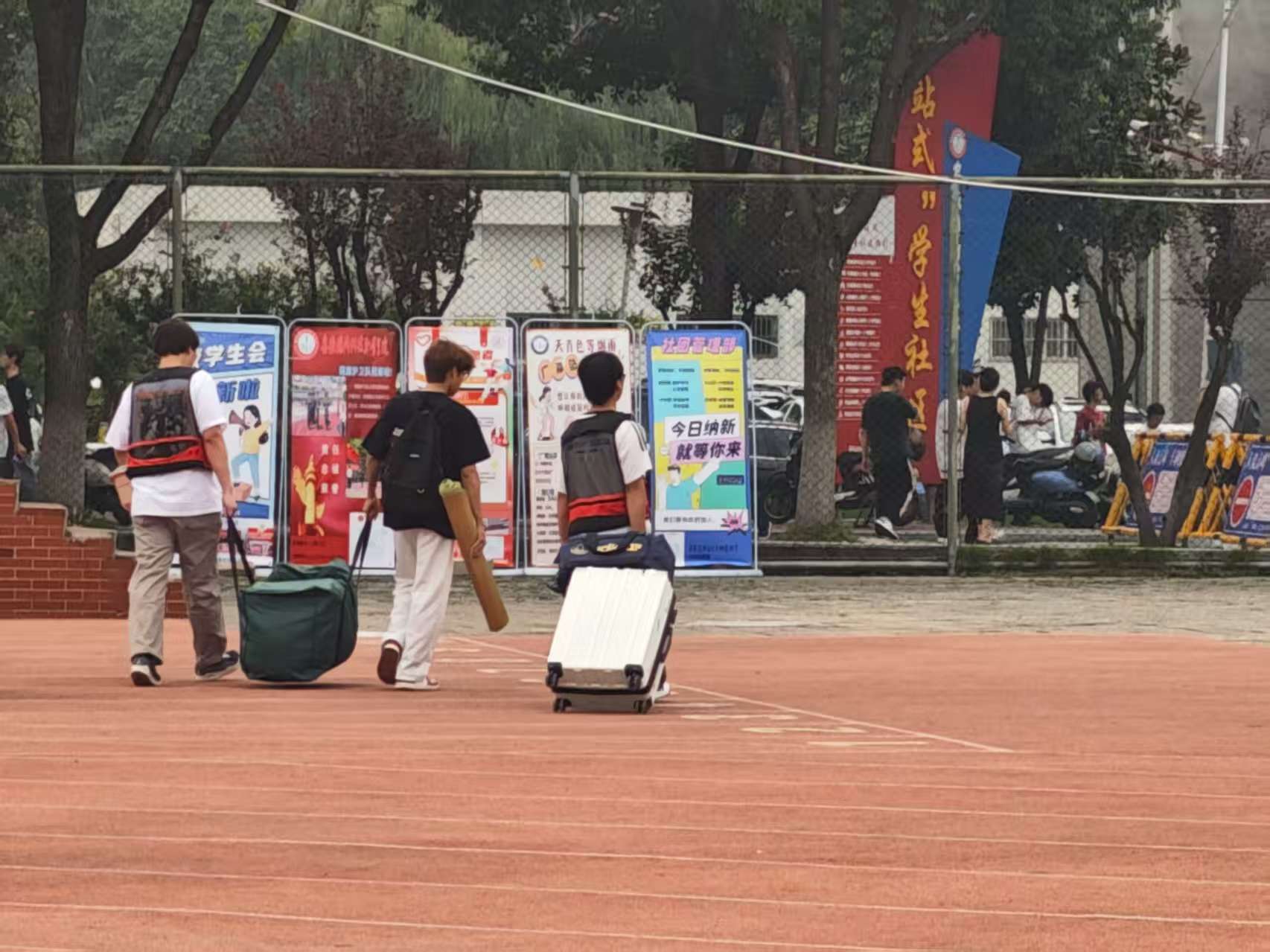 新生及志愿者在迎新展板处留念