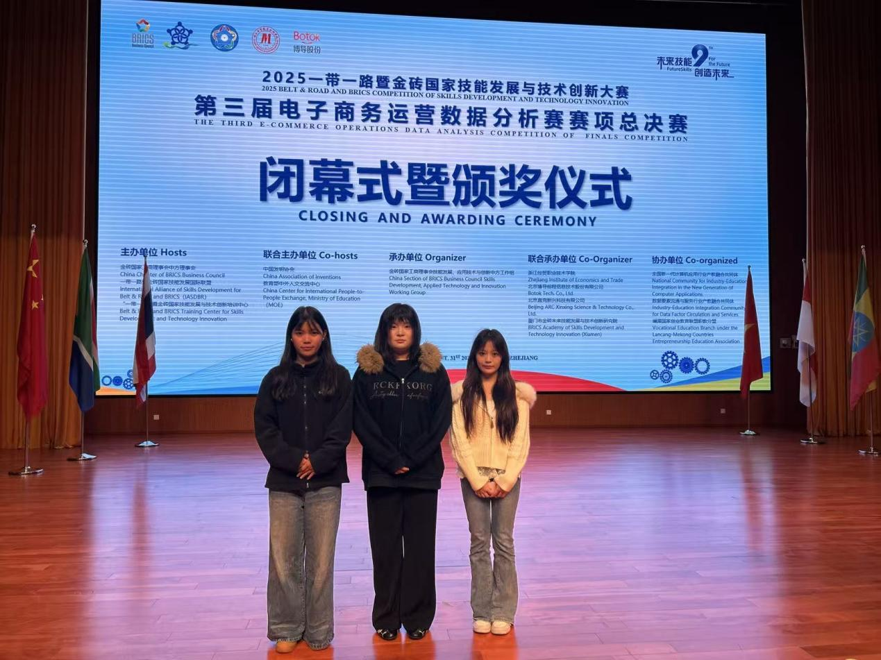 10月31日, 2025年一带一路暨金砖国家技能发展与技术创新大赛第三届电子商务运营数据分析赛项决赛在浙江经贸职业技术学院举行。万象城官网经贸管理学院教师朱小平、吴英指导的学生唐红燕、何梦瑶、张文君组成的参赛团队荣获全国总决赛三等奖。