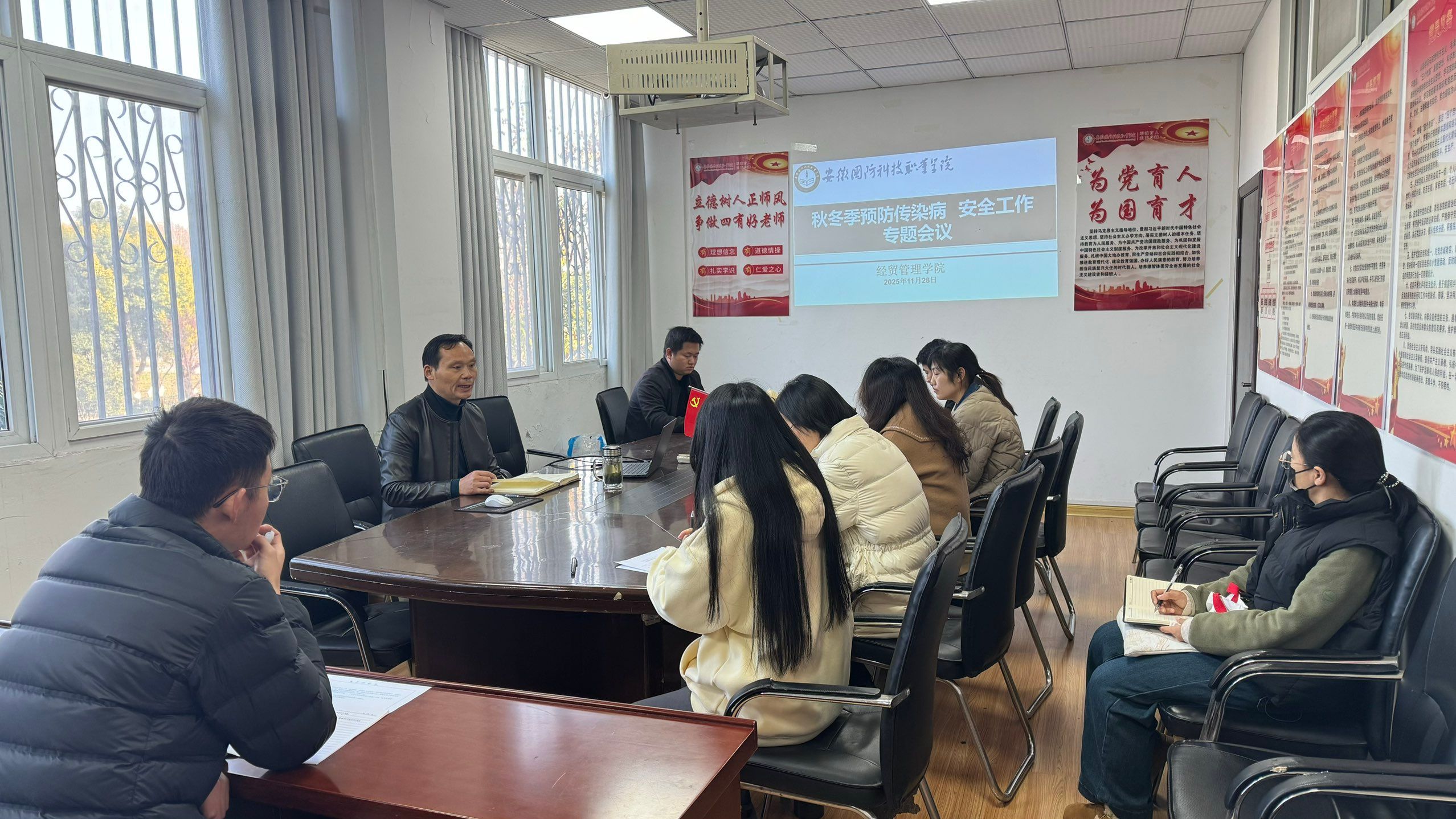 为扎实做好秋冬季预防传染病和安全工作,切实保障学生生命财产安全与校园稳定,11月28日,学院党总支书记刘峰主持召开专题会议,进一步压实责任,落实预防传染病和安全工作举措,全体专兼职辅导员参加。