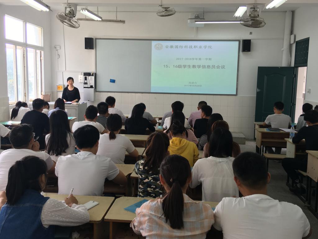 为强化教学质量监控,发挥学生教学信息员在教学环节中的重要作用,10月10日下午,高建办在2号教学楼203教室召开新学期首次学生教学信息员会议。来自机械技术学院、信息工程学院、经贸管理学院、城市建设学院、电气技术学院和汽车技术学院的48名学生教学信息员参加会议。会议由高建办叶高洁老师主持。