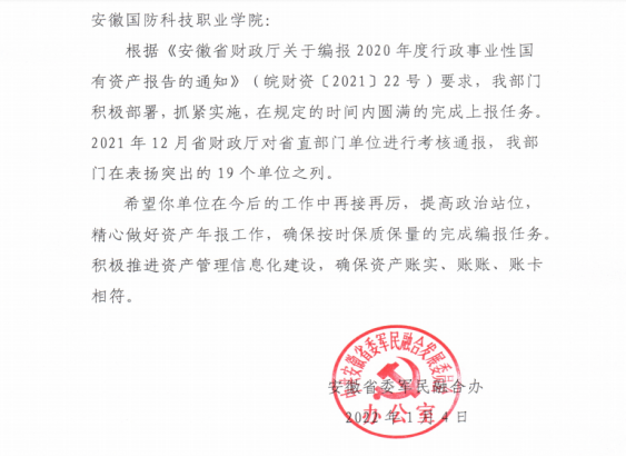 近日,省委军民融合办印发《关于2020年行政事业性国有资产报告编报情况的通报》,对万象城官网2020年度国有资产报告编报工作予以通报表扬。
