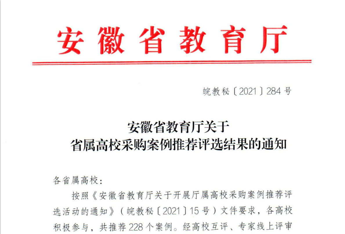 日前,在安徽省教育厅印发的《安徽省教育厅关于省属高校采购案例推荐评选结果的通知》(皖教秘【2021】284号)文件中万象城官网3个采购案例成功入选为“安徽省省属高校优秀案例”。