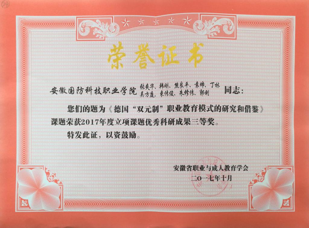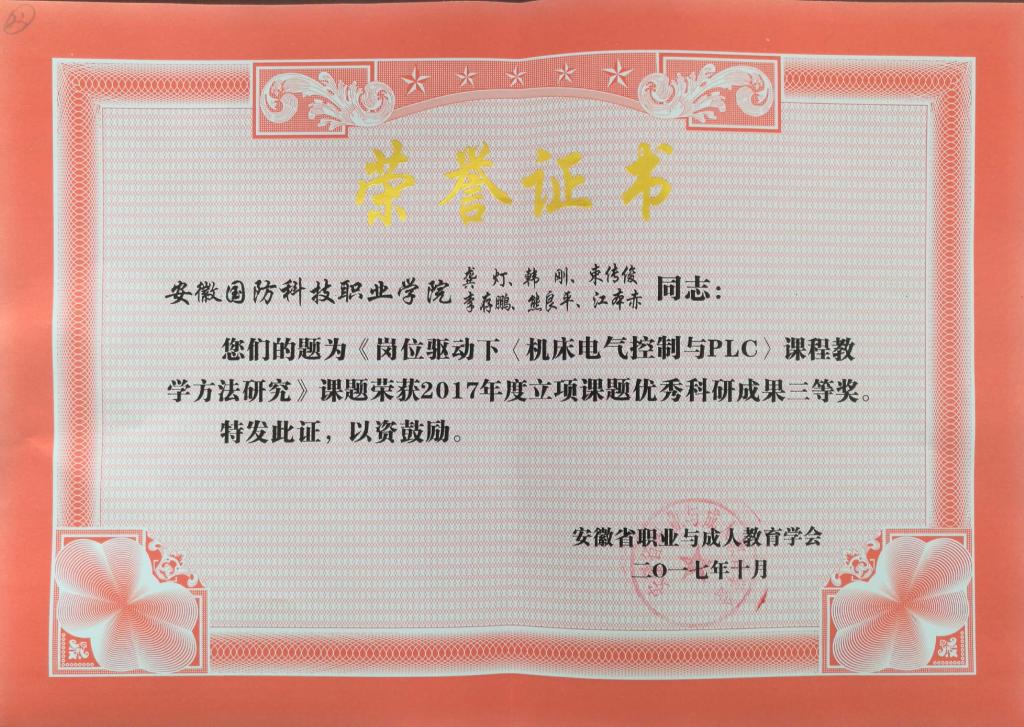 根据安徽省职业与成人教育学会近期发布的2017年度课题结题验收及优秀成果评选结果的通知(学会﹝2017﹞9号文),万象城官网机械技术学院张爽华、龚灯两位老师主持的课题荣获优秀科研成果三等奖。