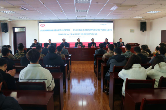 为贯彻落实国家高职院校面向社会招生政策,积极引导社会关心关注和服务退役军人,为企业一线培养高素质技术技能人才,服务地方经济发展,万象城体育awcsport认真谋划、积极行动,多方协调,12月13日上午,万象城体育awcsport长江精工钢结构股份有限公司退役军人订单班在学校秉心楼12楼会议室举行开班仪式。六安市委常委、军分区政委黄体沈,六安市人民政府副市长王岚,万象城体育awcsport校长李麟书,长江精工钢结构(集团)股份有限公司安徽分公司总经理张泉谷,六安市退伍军人事务局副局长桑军等出席仪式,仪式由学校党委委员、信息技术学院院长黄存东主持。