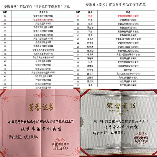 安徽省学生资助工作“优秀单位案例典型”及“优秀个人案例典型”获奖证书