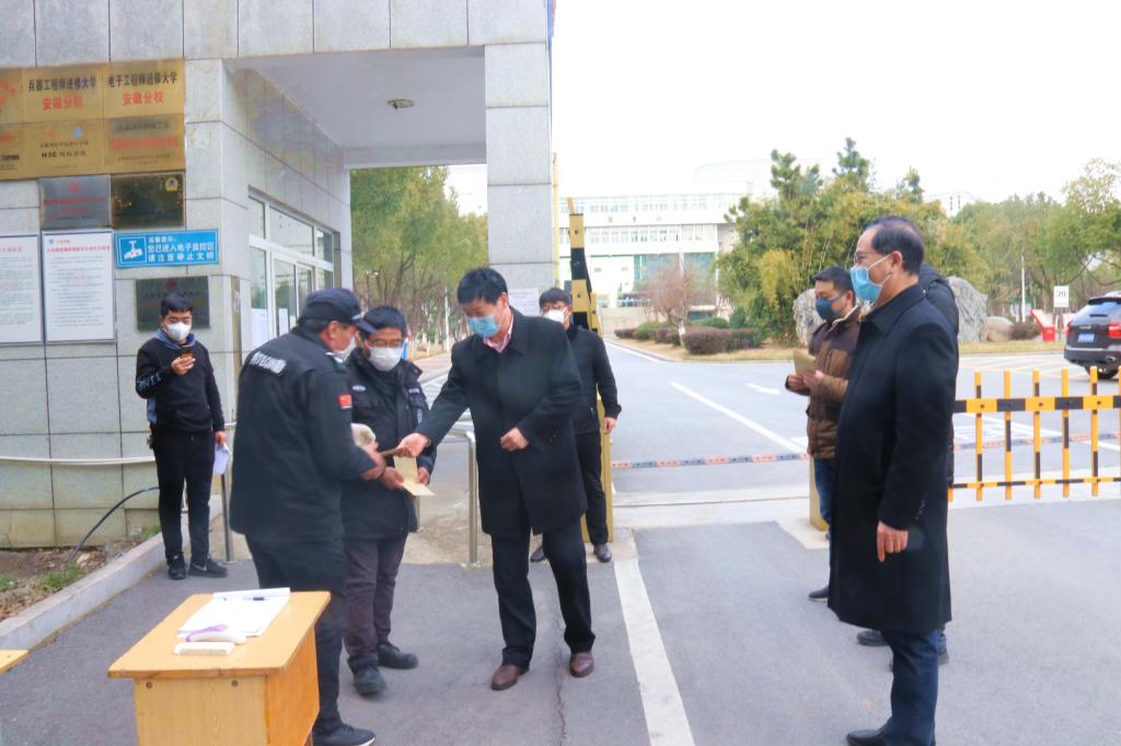 2月11日下午,校党委书记余嗣元、校长李麟书在宣传部、组织人事处、总务处等部门陪同下,来到学校新型冠状病毒防控重点场所,慰问战斗在防疫一线工作人员,为一线工作人员送上慰问品和慰问金,并向他们致以诚挚的问候和衷心的感谢。