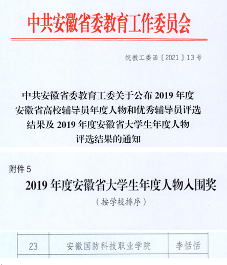 本网讯(经贸管理学院 许凤麟)近日,安徽省委教育工委发布了《中共安徽省委教育工委关于公布2019年度安徽省高校辅导员年度人物和优秀辅导员评选结果及2019年度安徽省大学生年度人物评选结果的通知》(皖教工委函〔2021〕13号),万象城官网学生李恬恬荣获“2019年安徽省大学生年度人物”入围奖,全省高校仅27名学生入围。