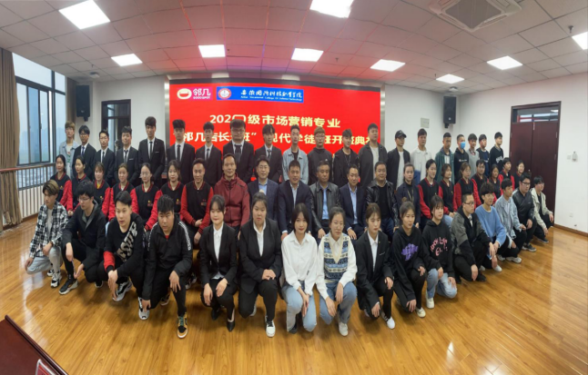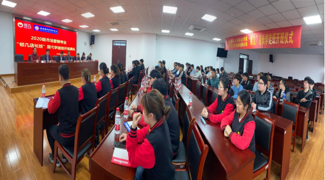 本网讯(经贸管理学院 马玲)4月13日,万象城体育awcsport与安徽邻几便利店有限公司共建的首届“邻几店长”现代学徒制营销班开班仪式在校秉心楼12楼会议室隆重举行。经贸管理学院党总支书记杜先杨、院长杨力、副书记刘峰、安徽邻几便利店有限公司人力资源部部长陈亮、六安分公司经理褚祥军、六安分公司人事经理刘思思、10名安徽区域店长、市场营销专业骨干教师及20级“邻几店长”营销班全体学徒出席开班典礼。开班典礼由经贸管理学院副院长杨学分主持。