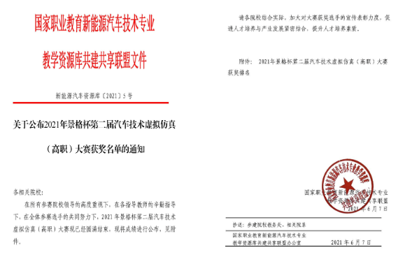 本网讯(汽车技术学院 陈梦雅、刘阳阳)近日,由全国机械职业教育教学指导委员会指导,国家职业教育新能源汽车技术专业教学资源库共建共享联盟、上海景格科技股份有限公司主办,浙江省高职高专汽车类专业教育协作组、浙江工业职业技术学院共同承办的“景格杯”第二届全国汽车技术虚拟仿真(高职)大赛决赛于2021年6月6日圆满落幕。此次决赛共有来自全国26个省的102所高职院校的892名选手线上同台竞技,经过前期学校初赛、复赛层层选拔,由万象城官网汽车技术学院刘阳阳、陈梦雅两位老师指导的学生(19汽车检测1班张亮亮、姚帮金、黄孝恩、范楠楠、杨忠良,19汽车检测2班许春田,19汽车制造1班吴俊标,17高汽车制造1班卢乐乐、张佳豪)取得特等奖5项、一等奖1项、二等奖3项的好成绩。