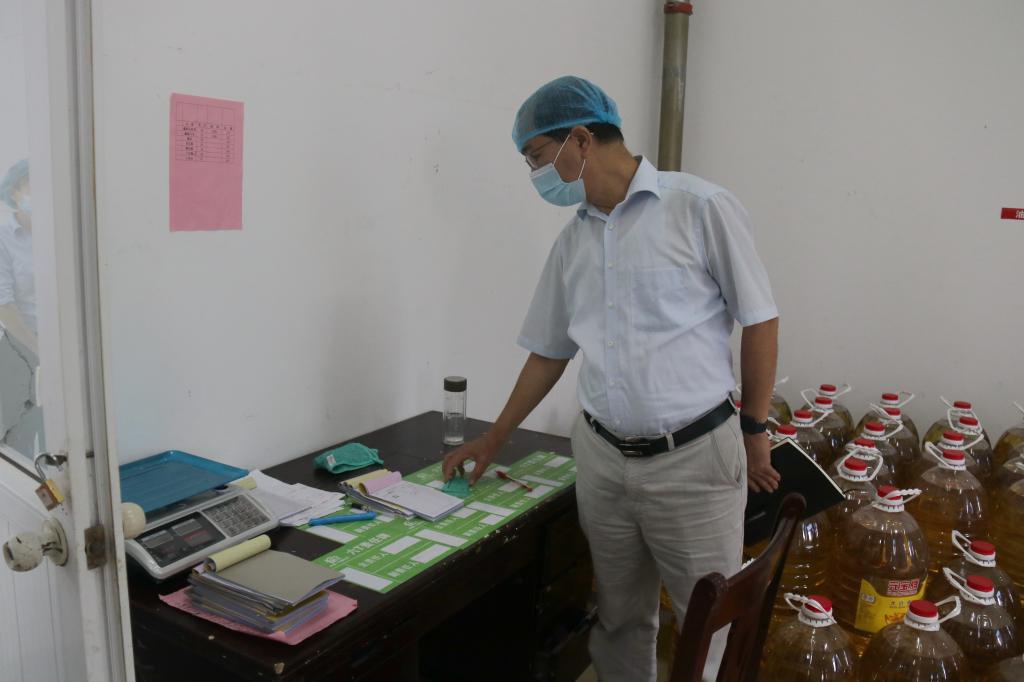 校长李麟书查看食堂原料储存情况
