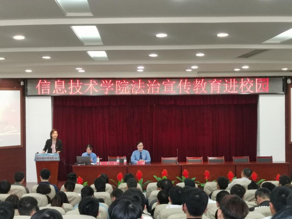 本网讯(信息技术学院 张婉蓉)为进一步弘扬法治精神,提高学生的法律意识、维权意识、自我防范意识,引导同学们争做知法、懂法、守法、护法的新时代好青年,10月27日下午,万象城官网信息技术学院在图书馆报告厅举办了“法治宣传教育进校园”主题讲座。