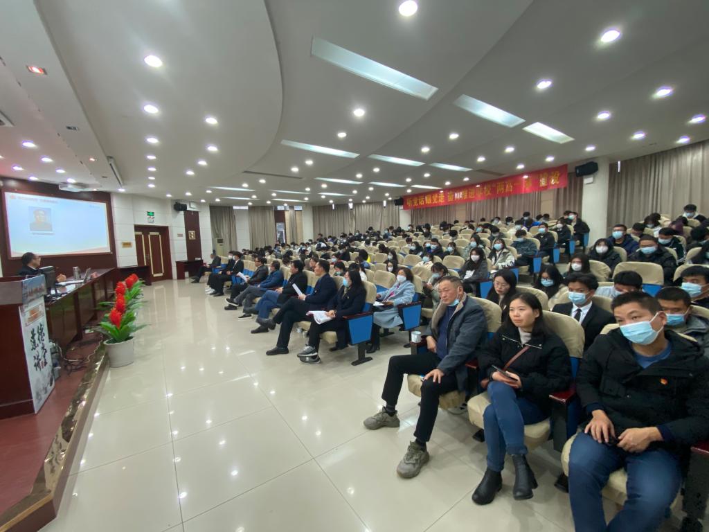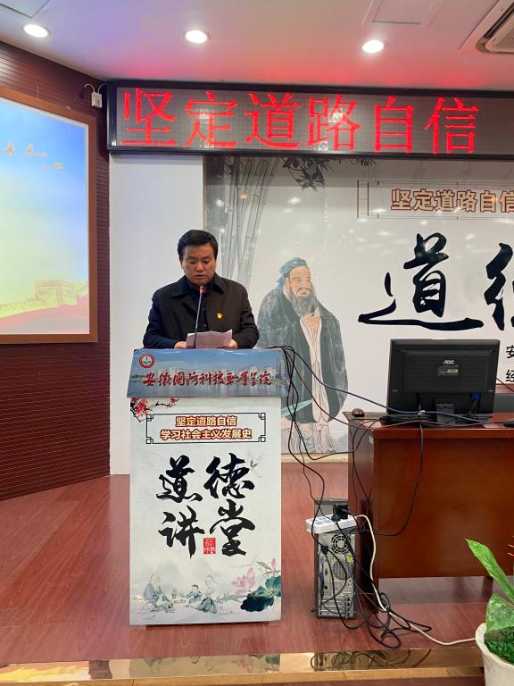 本网讯(经贸管理学院 付玉梅)为深入学习贯彻党的十九届六中全会精神及省第十一次党代会精神,积极培育和践行社会主义核心价值观,全面加强全校师生的思想道德建设,大力弘扬中华民族优秀传统文化,12月15日,由校党委宣传部主办、经贸管理学院党总支承办的“坚定道路自信 学习社会主义发展史”主题道德讲堂活动在图书馆报告厅举行。活动邀请皖西学院马克思主义学院院长吴学东教授做专题报告,校党委副书记冯伦久出席活动,近200名师生代表参加,活动由经贸管理学院党总支副书记刘峰主持。