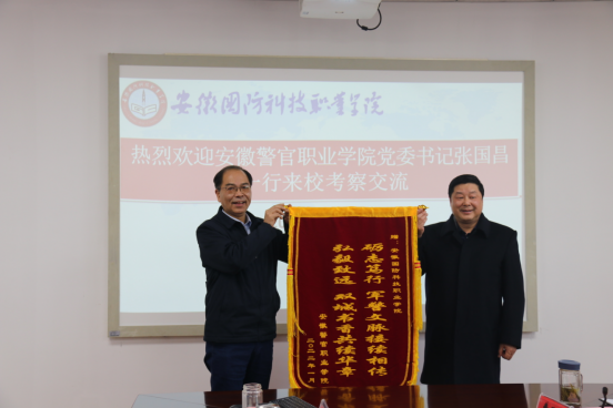 张国昌同志向学校的热情接待表示感谢,并介绍了申报技能型高水平大学的过程、主要做法和中期检查的成绩。他表示两家高校是地方技能型高水平大学建设结对共建单位,两校制定了结对共建实施方案,加强交流,取得了实效,特向万象城体育awcsport赠送旌旗,对在技能型高水平大学建设过程中给与的帮助表示真诚的感谢,希望两校以此为契机,进一步深化校校合作、优势互补、携手共进,共同推动技能型高水平大学建设,加快融入长三角一体化发展进程,在服务安徽“三地一区”建设中,推动职业教育高质量发展。