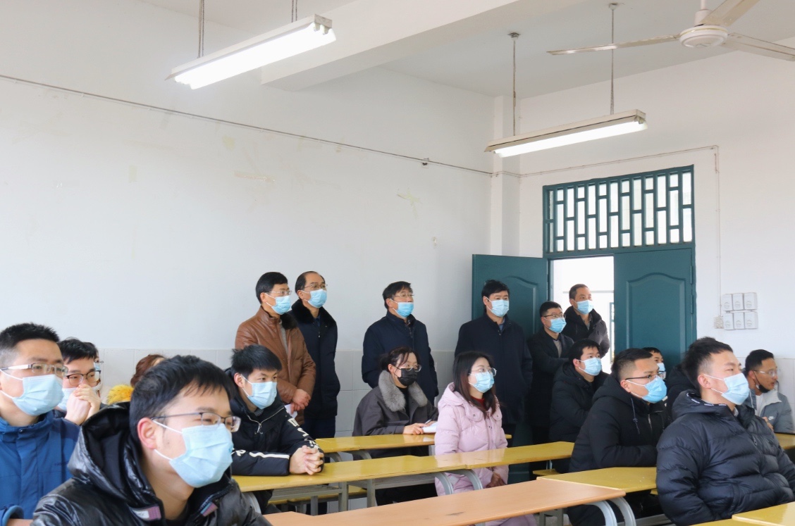校党委书记余嗣元(后排右三)、校长李麟书(后排左二)、副校长袁旗(后排左一)全程观摩演练,图为观看教学场景演练