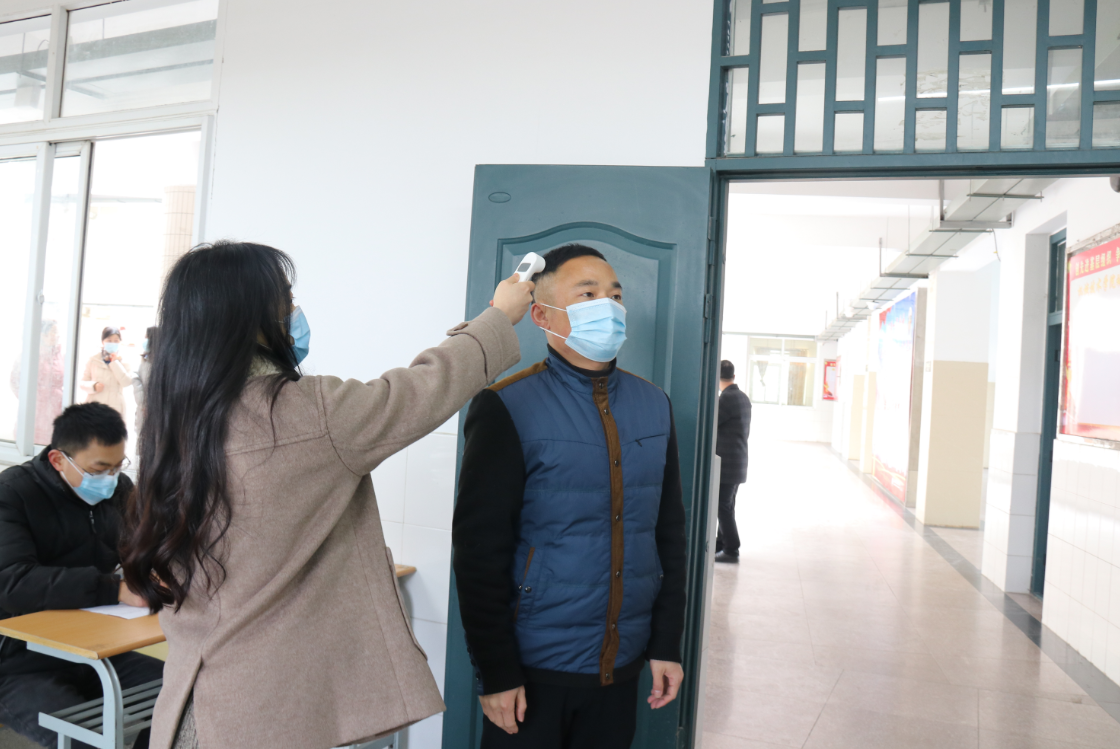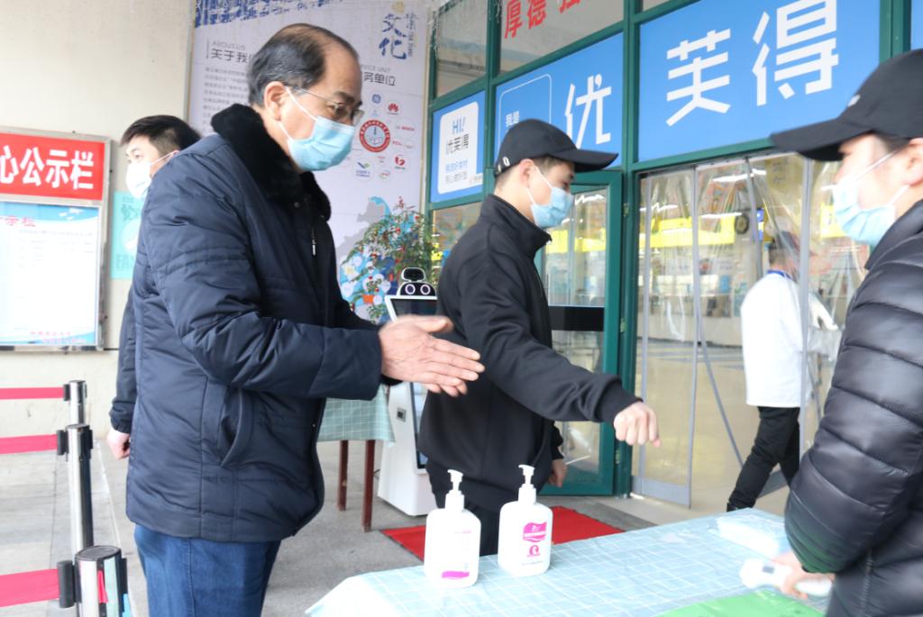 校长李麟书(左一)进入食堂前进行手消毒、测温