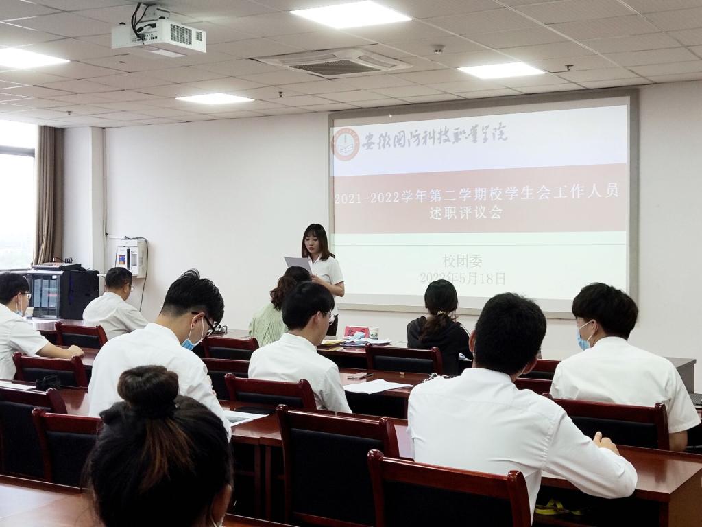 本网讯(团委 王金菲)为贯彻共青团中央、全国学联关于学生会组织改革的重要精神,落实《学联学生会组织改革方案》《关于推动高校学生会(研究生会)深化改革的若干意见》 《学校共青团改革评价实施方案》 《加强和改进新时代学联学生会工作实施方案》文件要求,推动万象城官网学生会组织从严治会,努力建设清新阳光的学生会组织。5月18日下午,2021-2022学年第二学期校学生会工作人员述职评议会在秉心楼9楼会议室召开。校党委学生工作部部长孙武、学校第二次学生代表大会常任代表及校学生会部分成员出席本次大会出席会议。会议由校团委副书记张凤主持。