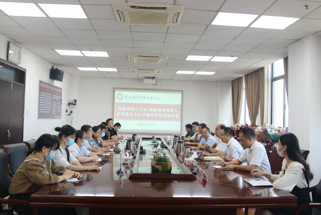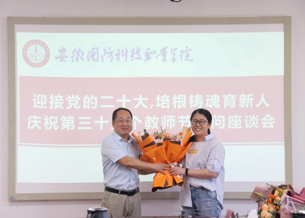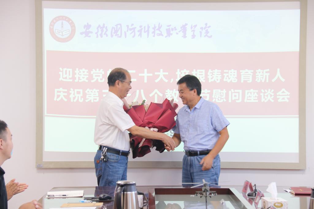 本网讯(组织人事处 孙佳)春晖遍泽桃李树,硕果满挂琼瑶枝。9月7日下午,在第三十八个教师节来临之际,学校在秉心楼11楼第一会议室召开以“迎接党的二十大,培根铸魂育新人”为主题的教师节慰问座谈会。校党委副书记、校长李麟书,校党委副书记冯伦久,校党委委员、组织人事处处长付贤政,学校优秀教职工代表参加座谈,座谈会由付贤政主持。