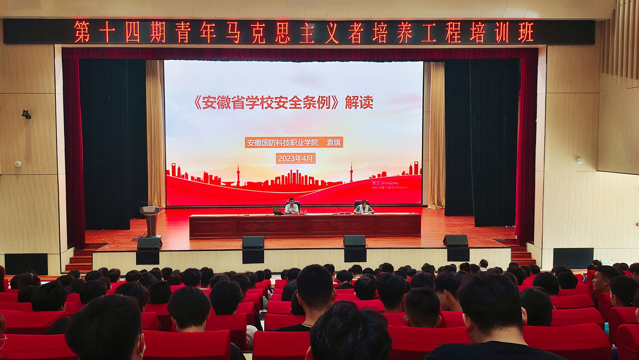 本网讯(校团委 罗丞筠)为进一步贯彻落实习近平总书记关于学校安全工作的重要论述,4月19日下午,学校在大学生活动中心多媒体报告厅召开《安徽省学校安全条例》专题学习培训会,校党委委员、副校长袁旗出席并作专题解读。学生处、总务处、团委、各二级学院相关负责同志,辅导员、班主任,以及149名“青马工程”学员全程听讲,校团委副书记张凤主持会议。