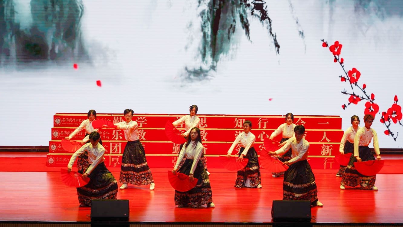 晚会共三个篇章,第一篇章以“初心不忘·团聚新时代”为主题。第一个上场的是汽车技术学院带来的合唱《我们走在大路上》,抒发了中国共产党带领中国人民敢教日月换新天的蓬勃斗志,充分展现国防学子满腔热血之情。经贸管理学院带来的合唱《祖国不会忘记》,雄壮有力、刚健豪迈,带领现场师生回忆辉煌事业背后的人物和故事,告诉我们功成不必在我,功成必定有我,要将理想融入祖国的宏伟壮志当中。信息技术学院带来的《歌唱祖国》,唱出国防学子对祖国母亲的依恋之心,从校园的青春激情转变为爱国的豪迈之情,为祖国歌唱,同时也是在歌唱梦想,歌唱新时代!大学生艺术团带来的胡璇舞《梦回敦煌》,动作轻盈舒展,神情悠闲自得,展现了中华优秀传统文化的独特魅力。