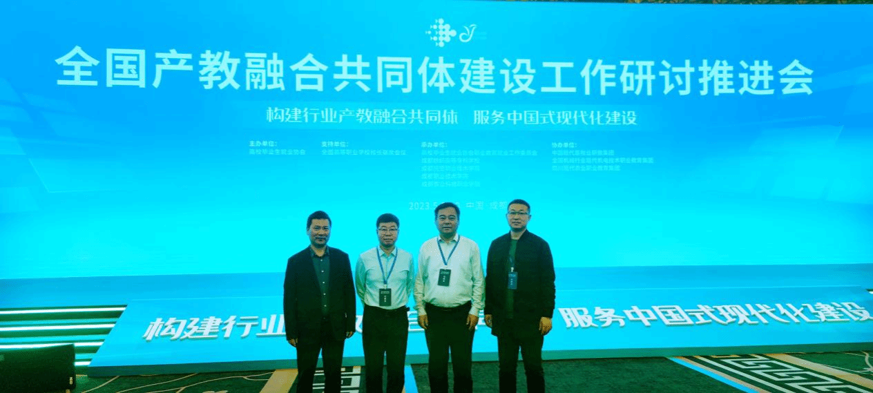 本网讯(校企合作办 聂世俊)5月9日至10日,以“构建行业产教融合共同体 服务中国式现代化建设”为主题,由高校毕业生就业协会主办的“全国产教融合共同体建设工作研讨推进会”在成都召开。来自部分地方教育行政部门、职教集团、职业院校和行业企业等单位代表1000余人出席会议。作为大会交流发言代表单位之一,学校党委委员、副校长李存鹏,党委委员、工会主席黄存东和校企合作办领导一行四人参加了会议。