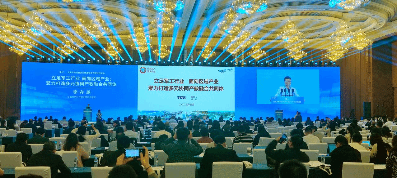 李存鹏代表安徽国防科技职教集团作了《立足军工行业 面向区域产业聚力打造多元协同产教融合共同体》为主题的交流报告。报告共三部分内容:一是新发展、新使命。展现学校风雨同舟、唇齿相依的发展历程,育人为本、强军首责的使命担当;二是新时代、新实践。围绕产教融合发展战略,展示丰富的产教融合实施路径和形式内容;三是新征程、新赛道。从服务国家发展战略、服务经济社会发展和服务人的全面发展对行业产教融合共同体未来发展进行深入探讨。