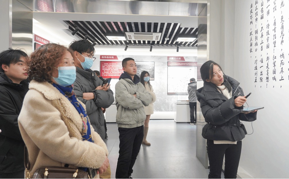 “行走的思政课”第二站——苏家埠战役陈列馆。苏家埠战役陈列馆分为徐向前元帅广场、苏家埠战役纪念园等。走进苏家埠战役纪念园,同学们便想起了大别山硝烟四起的一九三一年。“苏家埠战役是围点打援战术教科书级别的实例,同时开创了红四方面军大兵团作战的先河,极大地丰富了毛泽东军事思想,以至于被西点军校纳入军事必修教材供学员学习。”讲解员向同学们详细地介绍着。通过一幅幅图片、一段段真人比例制作的视频、一件件实物(仿制品),同学们仿佛回到战火纷飞的岁月。同学们边听讲解,一边驻足拍照,互相讨论着,都发出了感慨:没有革命烈士的浴血奋战,哪有我们今天的幸福生活,那个年代里条件极端刻苦,战士们克服种种困难也要取得战争的胜利,今天我们学习上的一点点苦又能算什么呢?