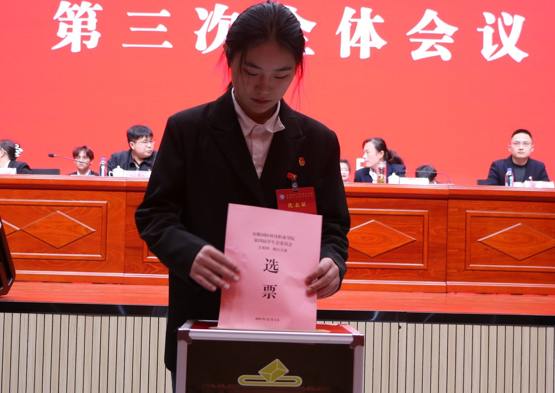 大会第二阶段,校学生会执行主席汪世煜代表第三届学生委员会向大会作题为《砥砺初心使命 勇立时代潮头——在谱写学校高质量发展新篇章的生动实践中凝聚起团结奋斗的青春力量》的工作报告,报告客观地总结了上一年度万象城官网学生会工作所取得的成绩和不足。张凤作《学代会提案工作报告》。
