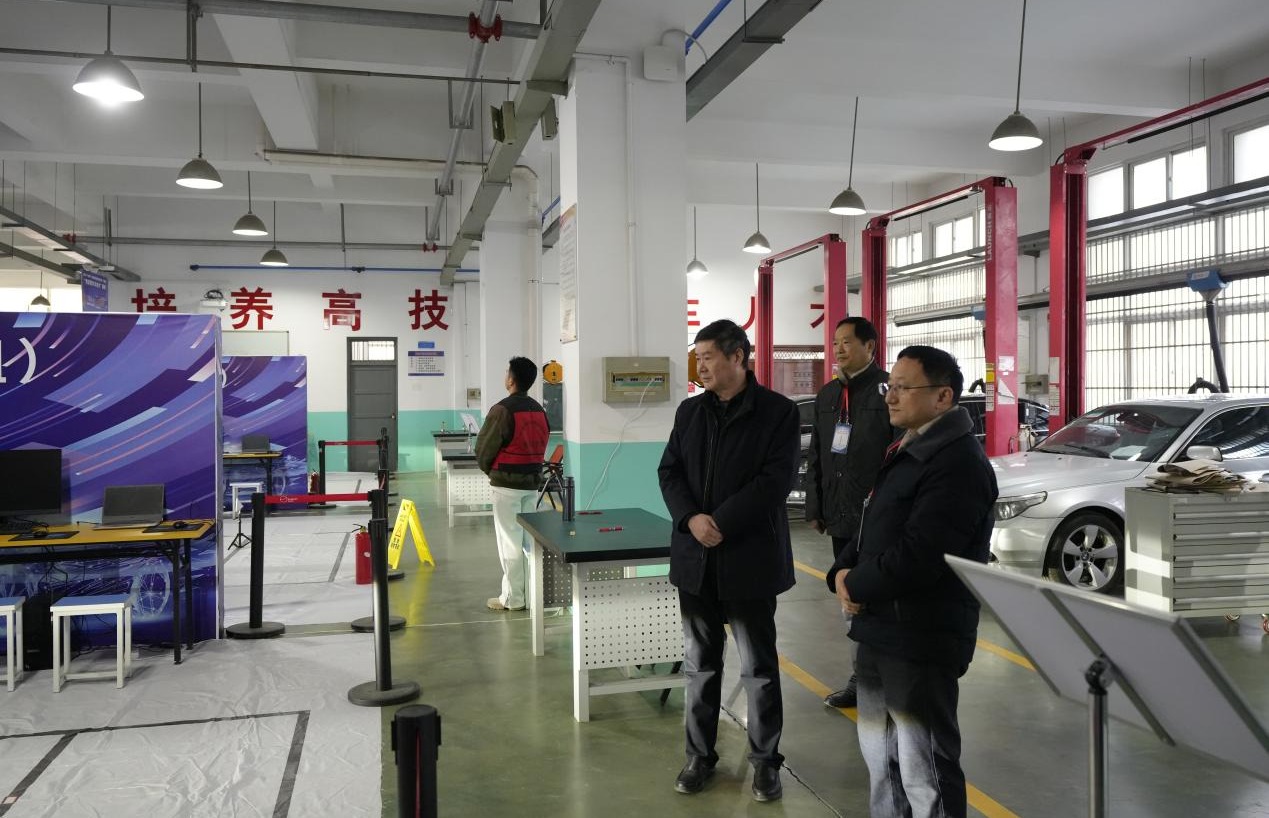 校党委书记余嗣元(左二)和省大赛办巡查员范后生(右一)一行考察赛场