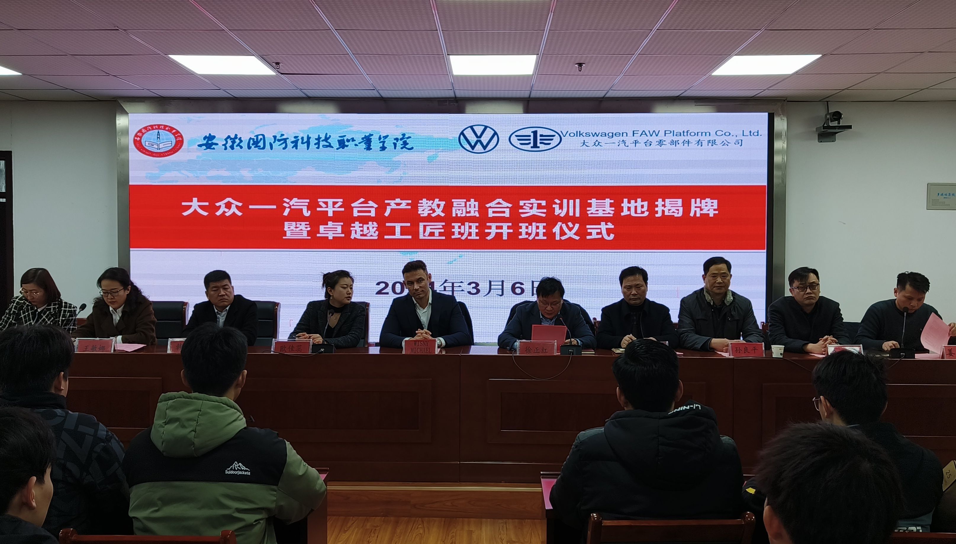 本网讯(汽车技术学院 黄世超)为进一步深化产教融合、校企合作,更好服务安徽新能源汽车“首位产业”,3月6日,学校在秉心楼12楼会议室隆重召开大众一汽平台产教融合实训基地揭牌暨卓越工匠班开班仪式。