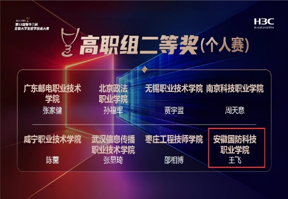 本网讯(信息技术学院 陆航)由全国高等院校计算机基础教育研究会和新华三集团联合主办的第十三届全国大学生数字技术大赛全国总决赛于4月27日举行。经过激烈的比拼,由信息技术学院陆航等指导的21级计算机网络技术专业学生王飞获全国总决赛二等奖。