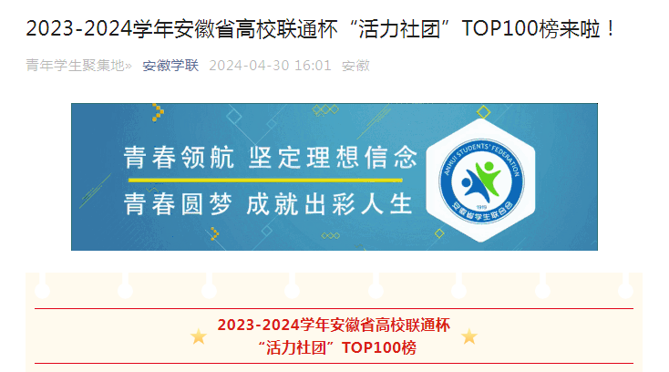 (本网讯 黄若兰) 日前,团安徽省委、安徽学联发布2023-2024学年安徽省高校联通杯“活力社团”TOP100榜,万象城官网新媒体中心协会荣登此榜。